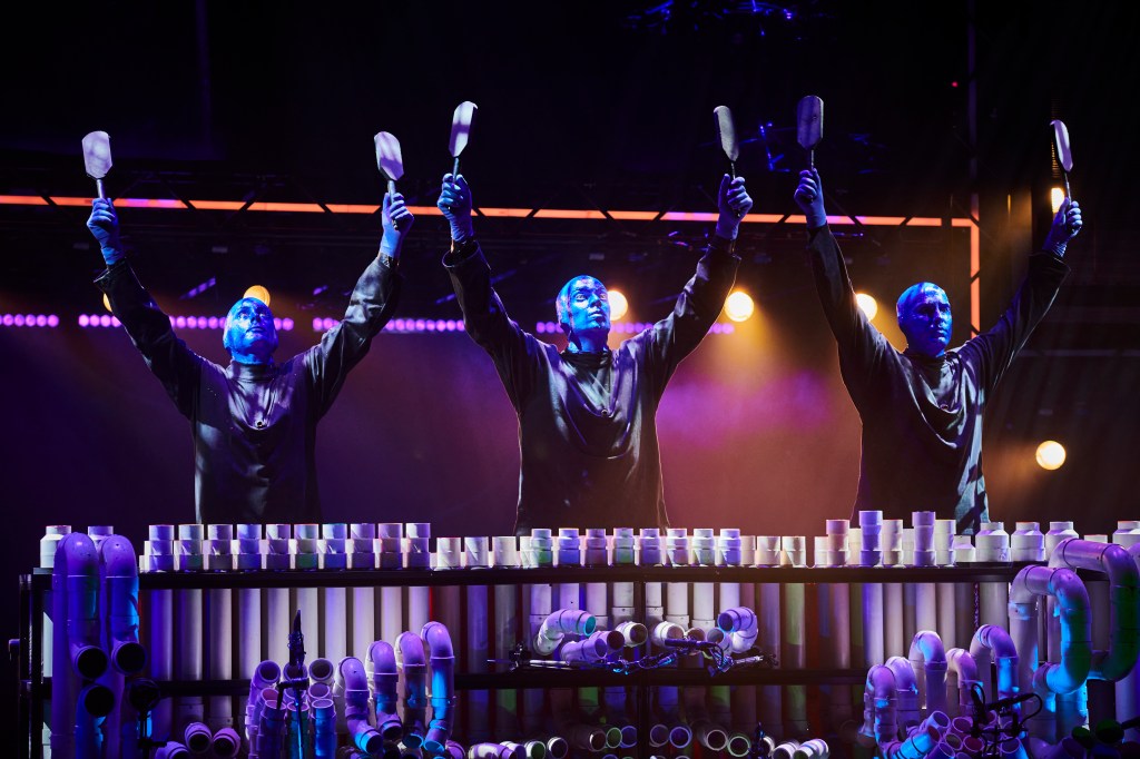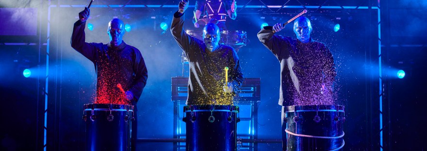 El Blue Man Group es un grupo de performance que gusta de romper la cuarta pared con bromas que no necesitan palabras, y siempre acompañados de percusiones y un ritmo vibrante que hacen un show dinámico y original.