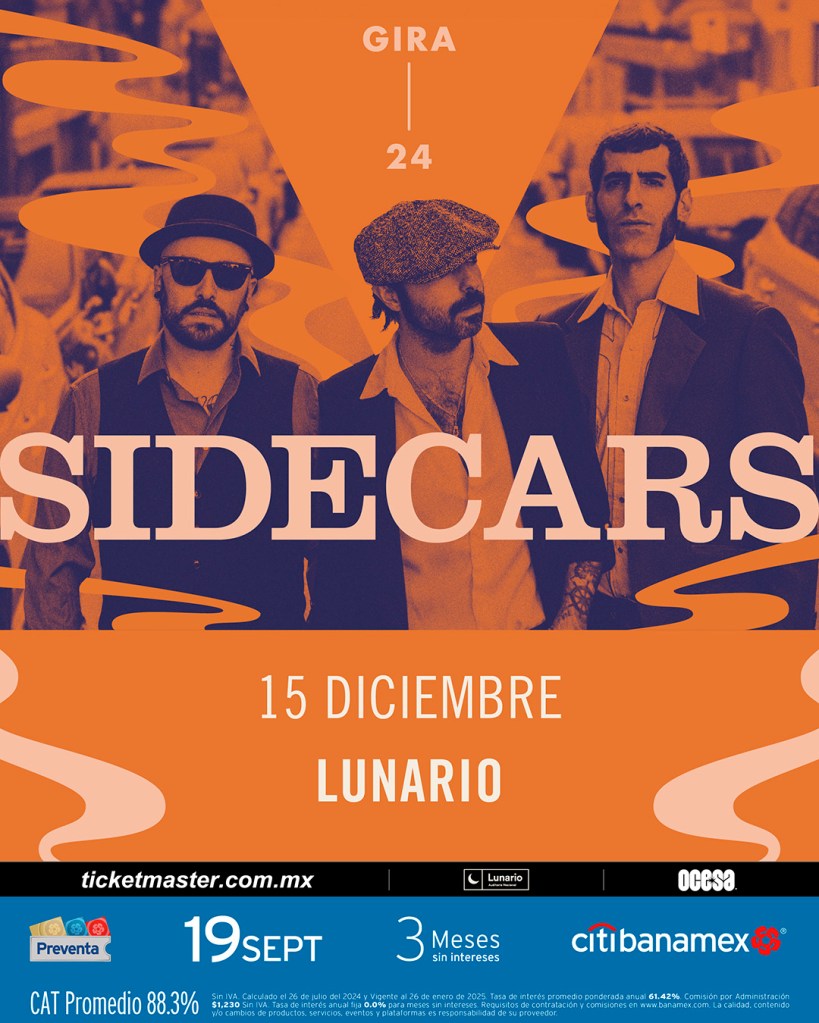 Juancho en guitarra y voz, Gerbass en el bajo y Ruly en la batería,son tres amigos originarios de Madrid, España, que siendo amantes de la música, forman en 2006 Sidecars, ahora con ya 18 años de carrera, varios éxitos en el colectivo universal como ‘Fan de ti’ o ‘Todos mis males’ y con 6 discos de estudio y 1 álbum en directo, este trío vuelve a los brazos de su fanaticada mexicana.