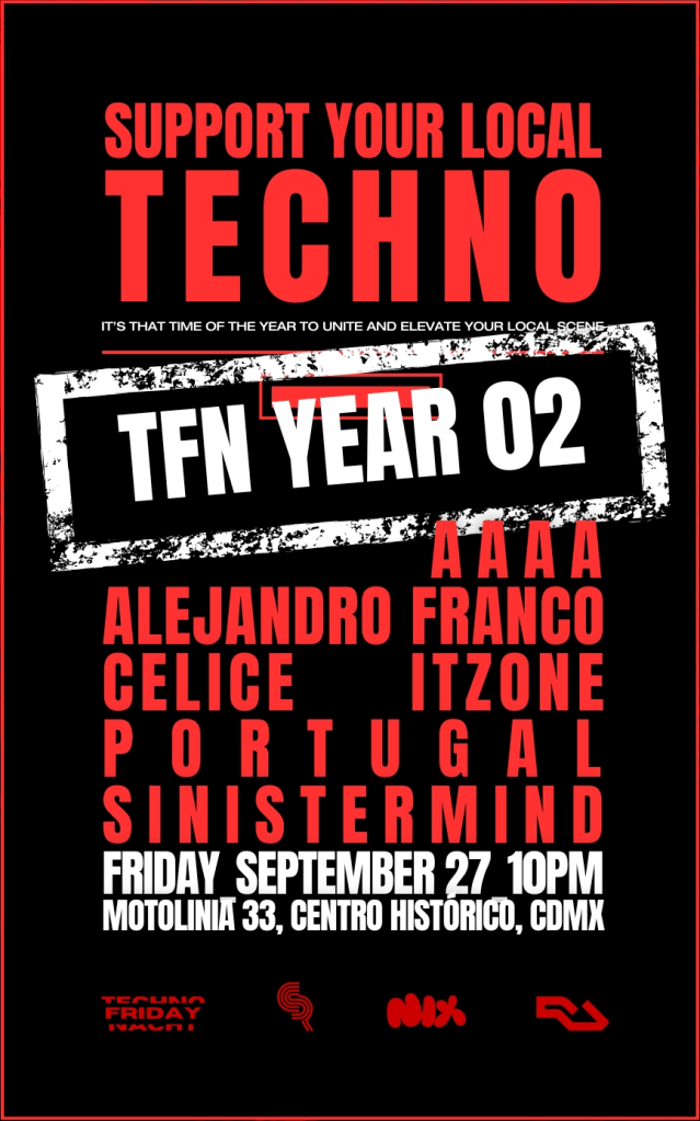 Techno Friday Nacth, nació en 2022 con una residencia semanal en el conocido recinto de Motolinia 33, donde todos los viernes los amantes del techno podíamos reunirnos a invocar chamucos al ritmo de beats intensos, sacados de las tornamesas de los mejores Dj de la CDMX.