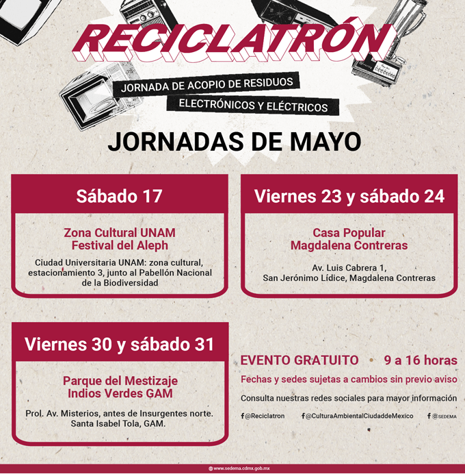 ¿Tienes una laptop descompuesta, pilas sueltas o un refri que nomás ya no enfría? Este sábado 17 de mayo el Aleph y Reciclatrón se fusionan para recibir todos los desechos electrónicos de forma segura, legal y sin contaminar.