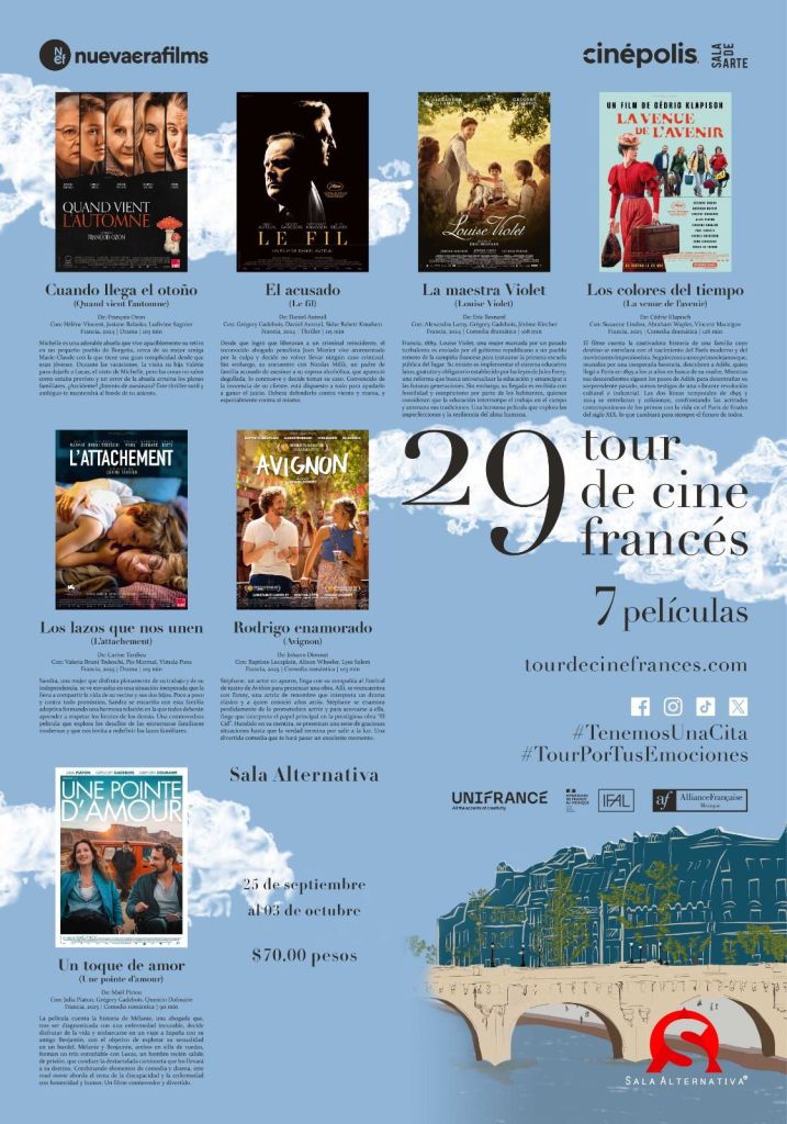 Para más información sobre las películas, horarios y ubicaciones, puedes visitar el sitio oficial del Tour de Cine Francés en www.tourdecinefrances.com/