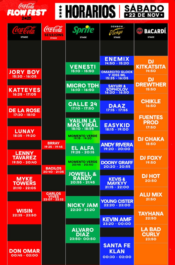 Porfin llego la fecha marcada para que todos los amantes del reggeton y el urbano, celebren y bailen con los mejores artistas del genero. El Flow Fest 2025 se celebrara este 22 y 23 de noviembre, y aquí te dejamos los horarios para que te pongas de acuerdo con tu pandilla y pasen un festival increíble.