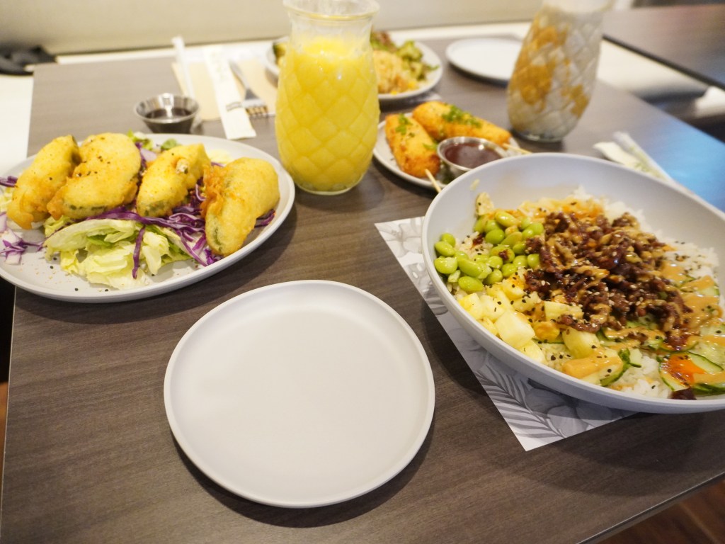 El menú es amplio y se adapta a cualquier hora del día. Por la mañana hay sandwiches energéticos, waffles, french toast y açai bowls, además de un Matcha Bar con lattes, iced y toppings creativos. Durante todo el día puedes disfrutar de poke bowls, ramen, arroces fritos, musubis, brochetas y postres, junto a bebidas especializadas, smoothies y bubble tea personalizable.
