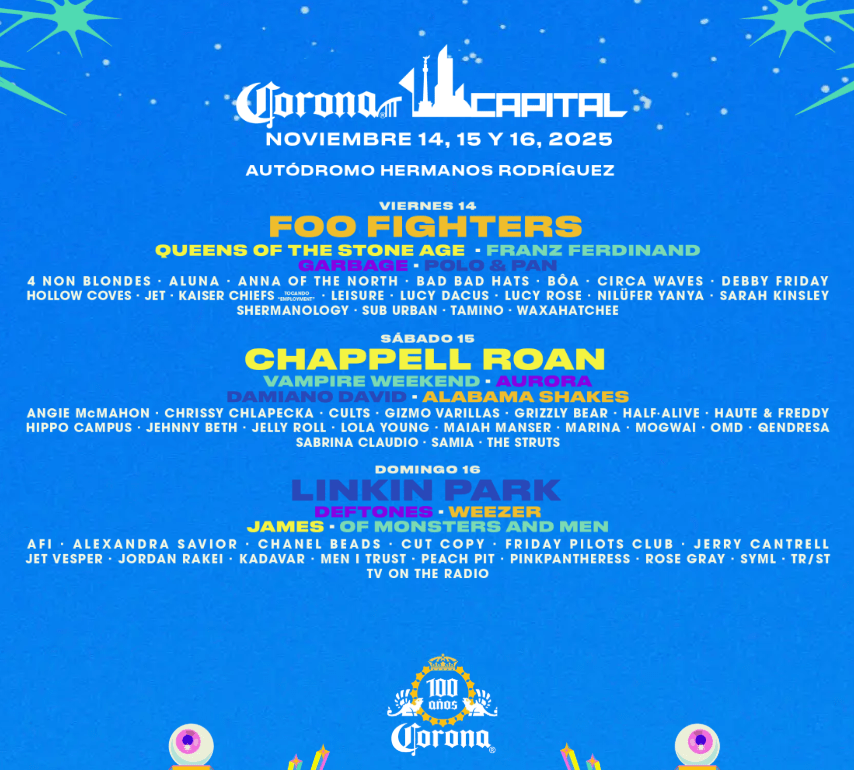 Si aún tenías duda de a qué hora llegar al Corona Capital, tranquilo, ya están los horarios listos para que vivas tres días de pura música sin perderte a tus artistas favoritos. Del 14 al 16 de noviembre, el Autódromo Hermanos Rodríguez se llenará de energía con un cartel impresionante que incluye a Foo Fighters, Linkin Park, Vampire Weekend, Deftones, Weezer, Alabama Shakes y muchos más.