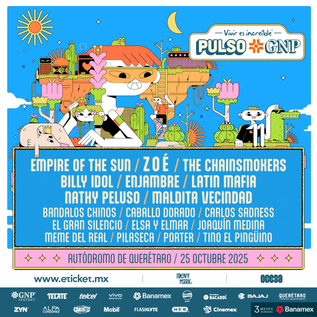 El Pulso GNP 2025 reunirá a grandes nombres de la escena nacional e internacional como Empire of the Sun, Zoé, The Chainsmokers y Latin Mafia, entre otros. La cita será en el Autódromo de Querétaro, y los boletos ya están disponibles a través de la plataforma e-ticket.