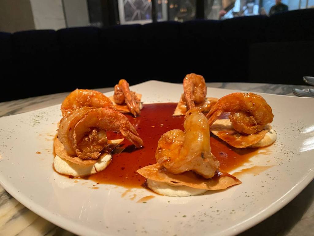 Para la entrada elegimos unos buñuelos de camarón, que vienen en una presentación de seis piezas, bañados en salsa de tamarindo y montados sobre queso crema. Una explosión de sabores para el paladar. Gran arranque.
