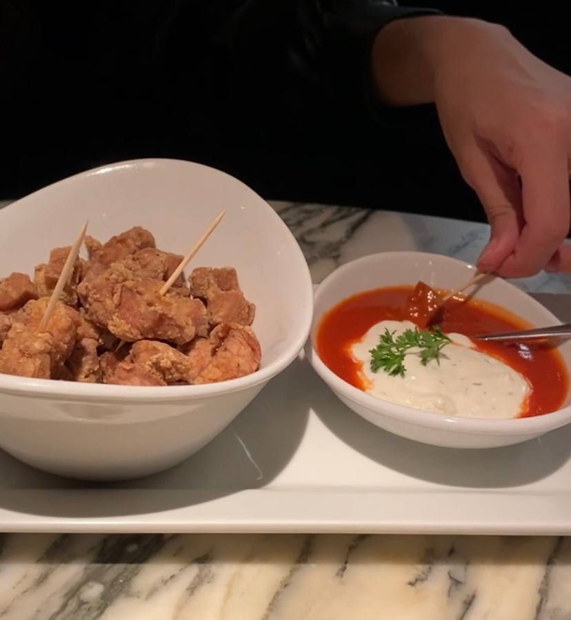 También nos animamos con unas palomitas de cerdo acompañadas de un dúo de aderezo de queso de cabra con una salsa de chiles secos con cerveza, ideal para picar y abrir apetito, en lo que buscamos las bebidas y platos fuertes.