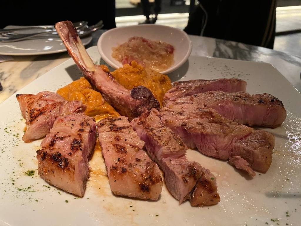 También ordenamos un tomahawk de puerco, que venía acompañado de mermelada de cebolla y puré de papa con chipotle y queso. Un platillo vasto, ideal para todos aquellos de buen diente.