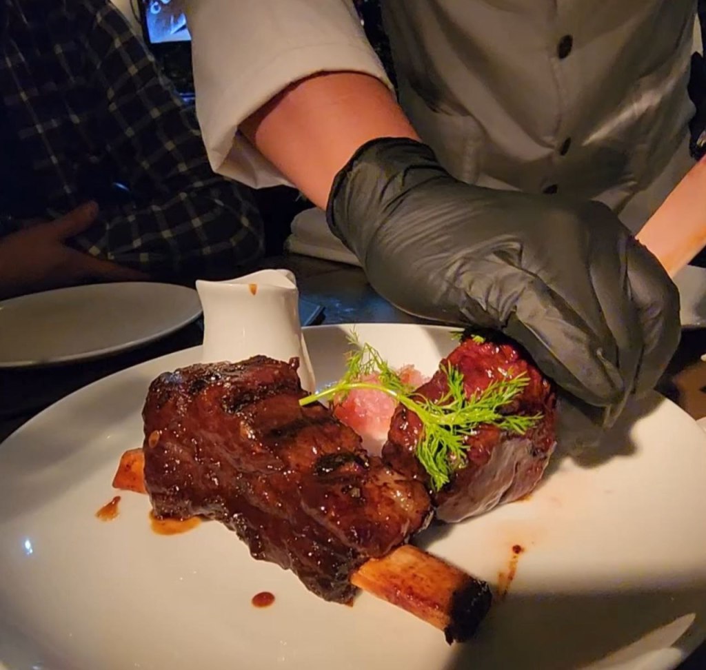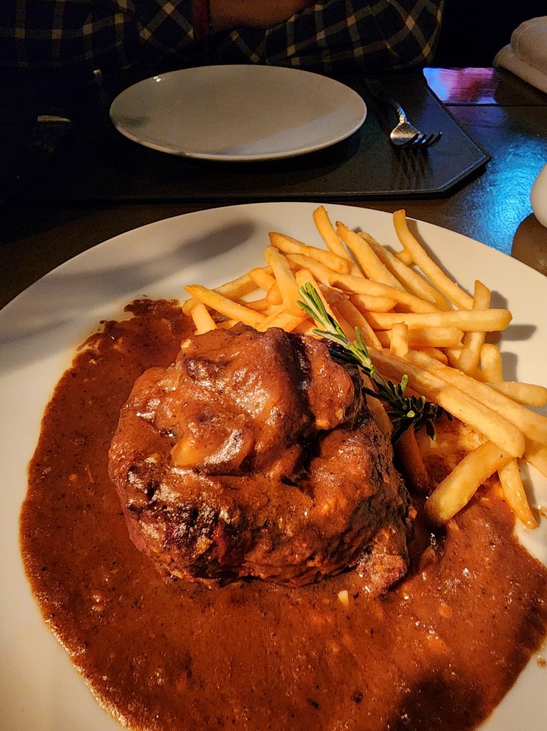 De plato fuerte traíamos antojo de un filete en su jugo que es bañado en una reducción de jugo de carne acompañado de papas a la francesa y un Short Rib bañado en salsa de tamarindo. La carne estaba en su punto, bien cocida y muy sabrosa.