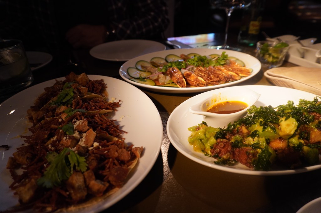 Para empezar nuestro festín ordenamos un chicharron de Pulpo con salsa macha que estaba muy sabroso. Unos tacos de Fideos de chicharrón muy ricos y un aguachile de camarón.