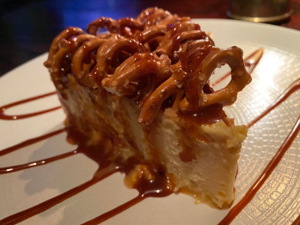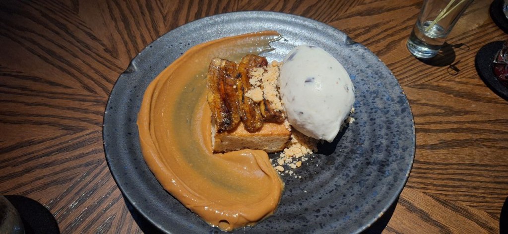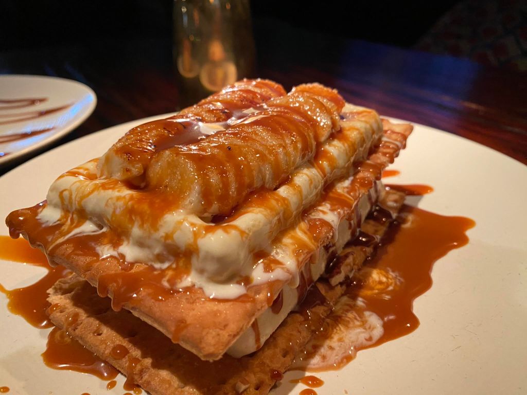 Chequen nada más este pay de plátano flameado directamente en tu mesa, una delicia, y nos pedimos también este flan de elote con cajeta y pretzels, todo un festín para el paladar.